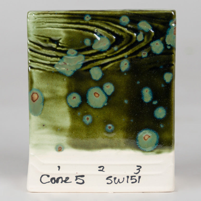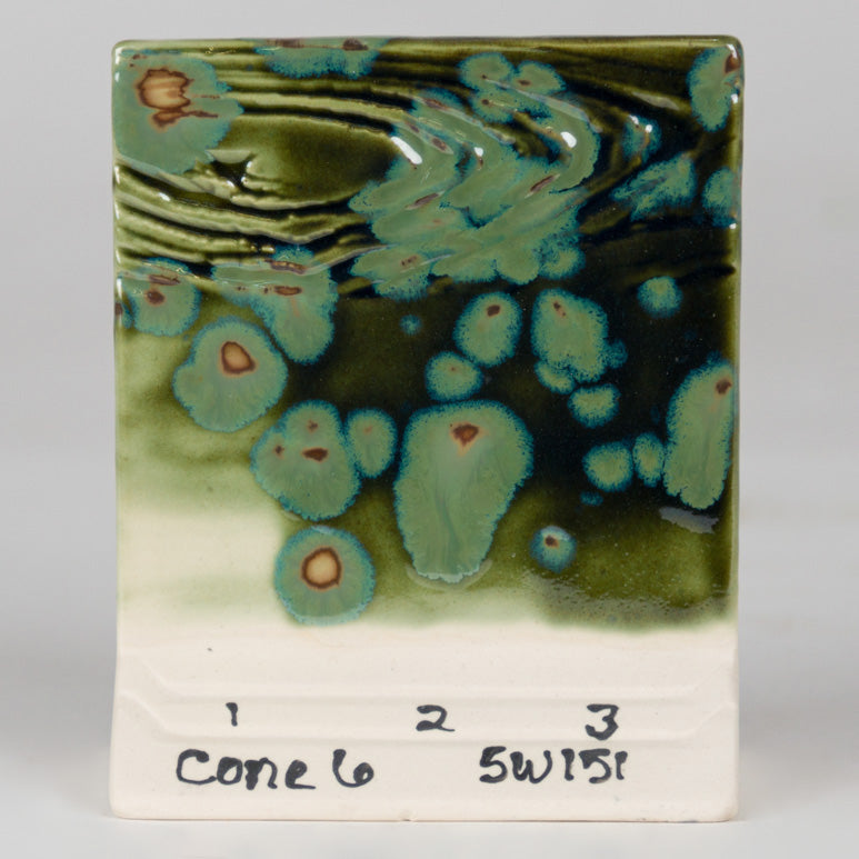 Cone 6 oxidation: Olive Float is a dark green gloss glaze that contains a light green crystal. It is a dazzling glaze that mimics crystalline glazes without the fuss of complicated kiln programing!