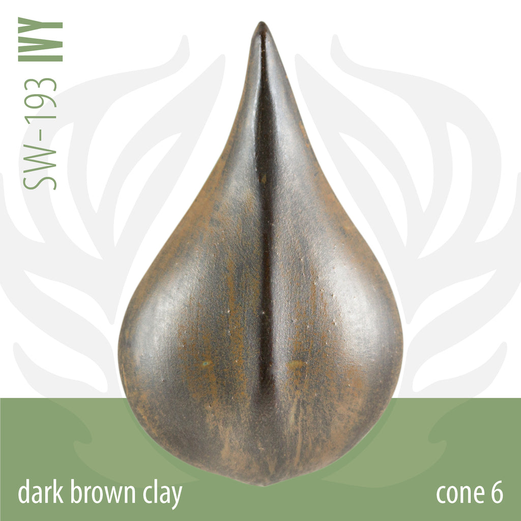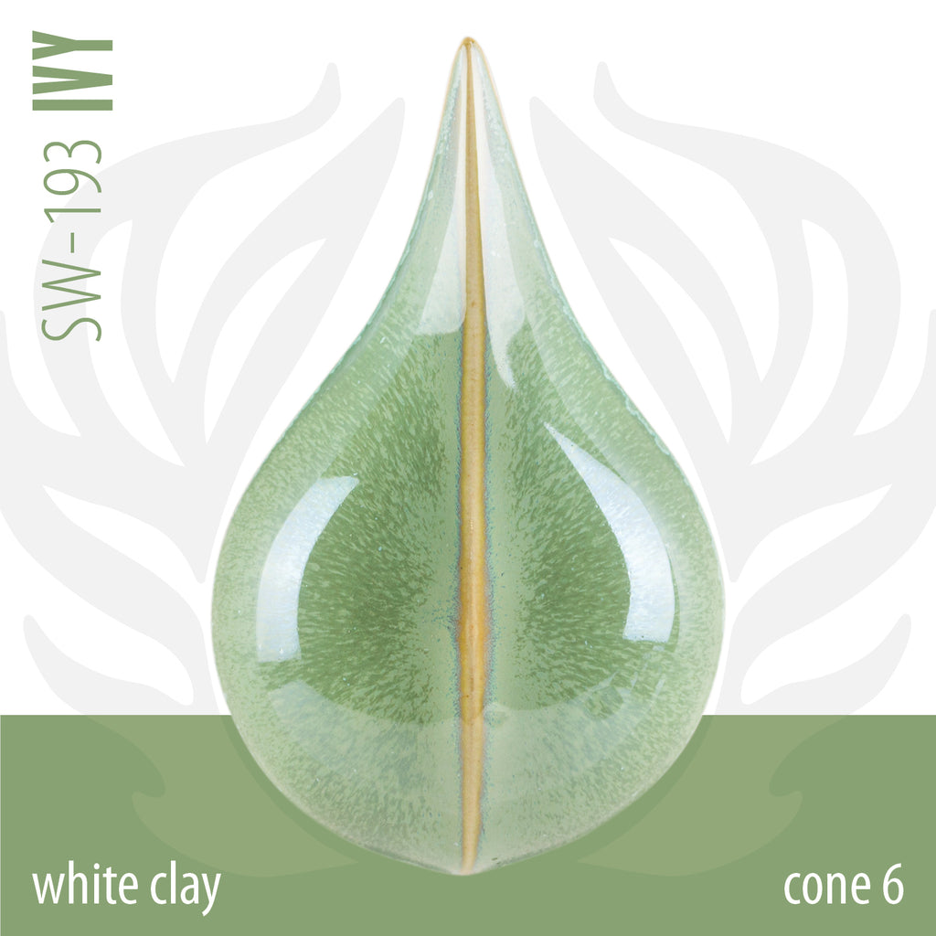 Cone 6 oxidation: Ivy is a glossy, opaque, variegated green glaze with that breaks over texture and has an iridescent sheen. Green micro-crystallization may develop.