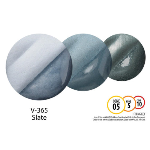 Slate Velvet Underglaze is a dark, bluish-gray at cone 05 that darkens to a deep, slate shade when fired to cone 5 and transforms into a melancholic blue-green at cone 10. A clear glaze accentuates the color of the underglaze significantly at any temperature.