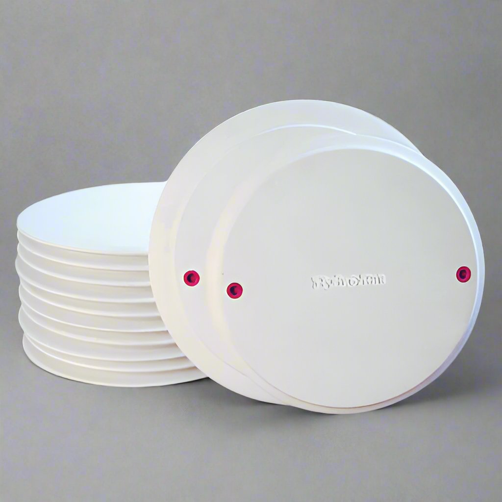 The Hydro-Bat was designed to fit on wheel heads that have bat pins spaced 10 inches apart on center. The hard rubber grommets cast into the underside of each Hydro-Bat will not swell or change shape and are sized to fit over a 3/8" diameter bat pin head. These bats must be wet prior to placing clay onto the bat for throwing.