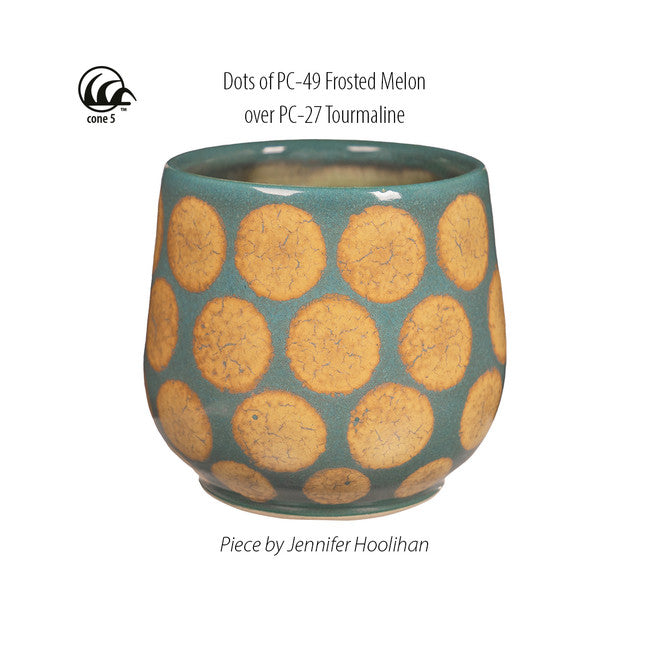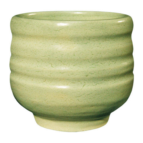 Frosted Melon is a very unique glaze with some qualities that can be exploited for additional interest. It has a massive, beige float with heavy application. This float "cracks", showing the green of the glaze below while still maintaining a smooth, satin surface. This subtle glaze is beautiful on smooth and textured ware alike. The glaze color is susceptible to variation due to iron fuming from other pots nearby in firing.
