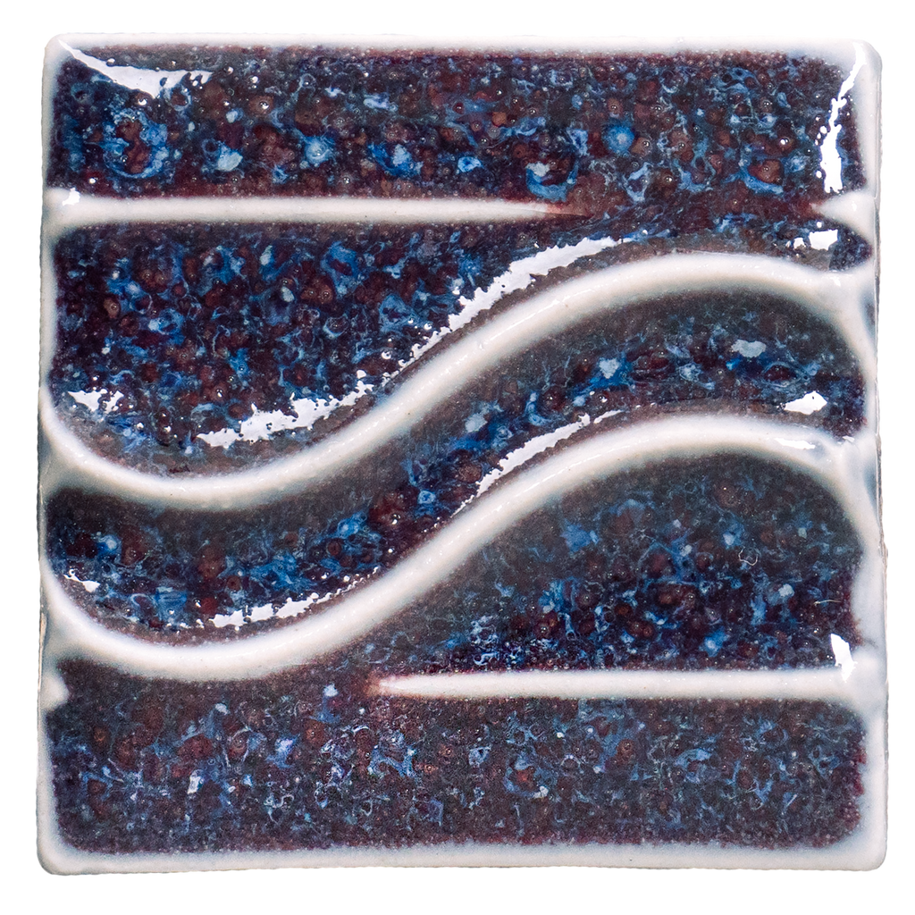 PC-72 Fire & Ice is deep red where thick and icy blue where thin. Fire & Ice is a reduction copper red for electric firing with a dramatic icy blue-colored break on texture. Apply three coats for best oxblood red color.