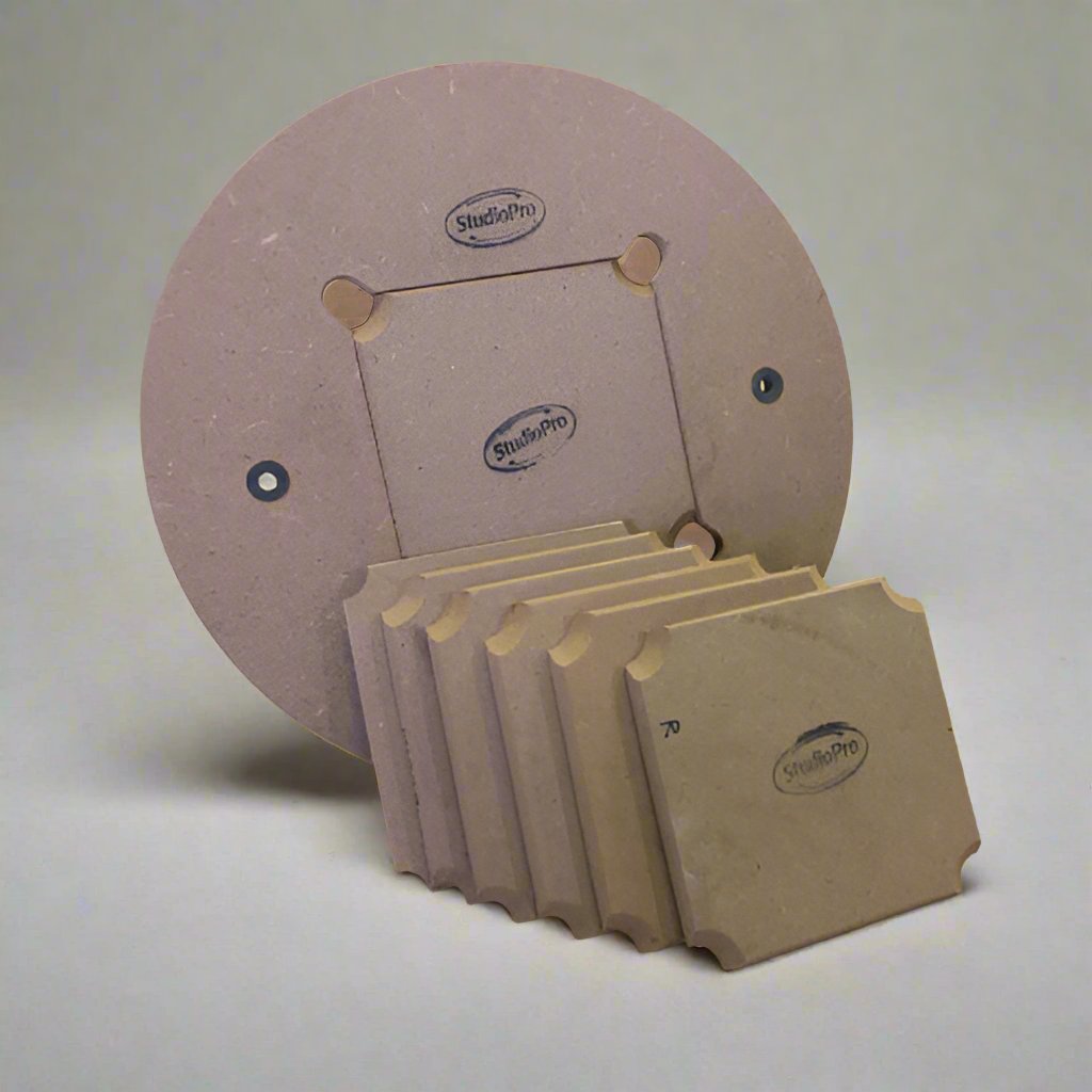 The Space Saver Bat System allows you to throw multiple small bowls and cups in one sitting and save you lots of shelf space. This system is 100% compatible with the Wonderbat system. Made from 1/2" exterior grade MDF, this bat system is durable and warp resistant. The through-hole rubber grommets ensure a secure fit on your wheel head and can be used on both sides. This feature further prevents warping over time.