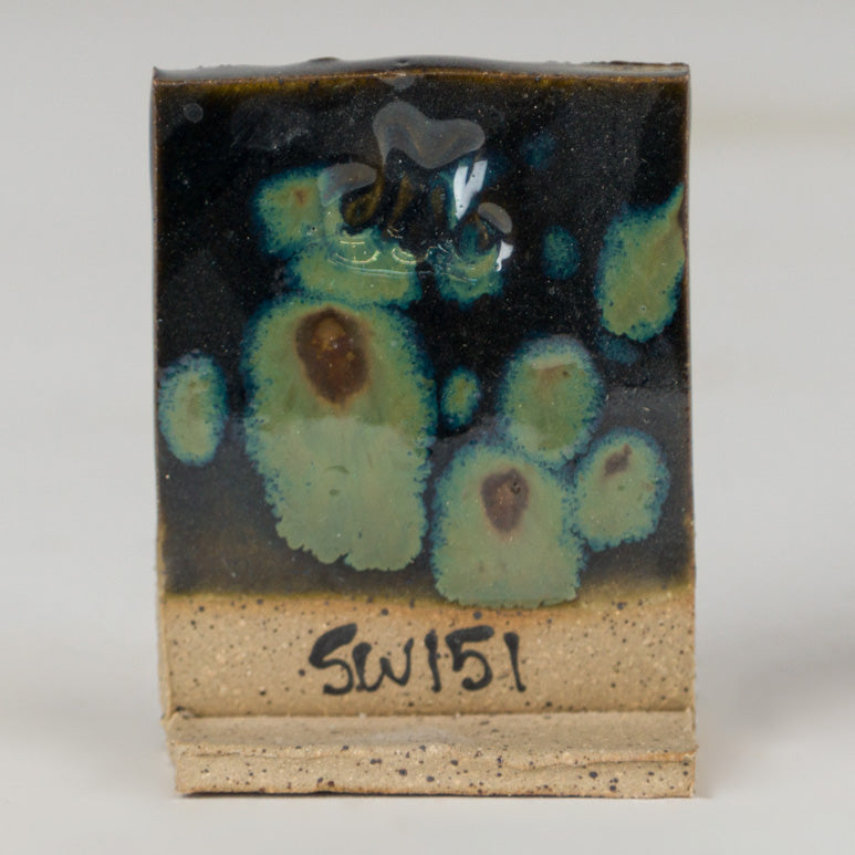 Cone 6 oxidation: Olive Float is a dark green gloss glaze that contains a light green crystal. It is a dazzling glaze that mimics crystalline glazes without the fuss of complicated kiln programing!