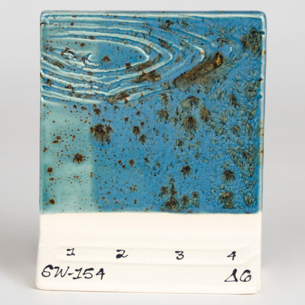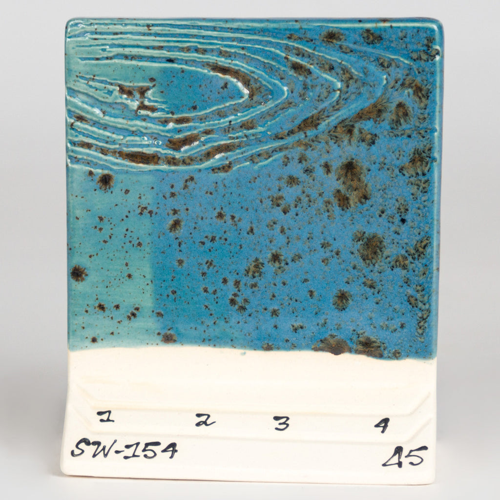 Cone 6: Shipwreck is an aquamarine gloss glaze that contains an iron crystal. As the crystal melts, a small iron speck appears. The glaze appears mysterious like underwater footage.