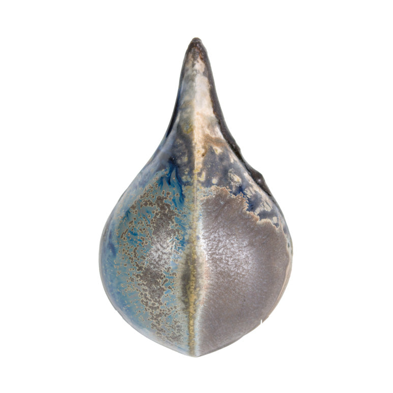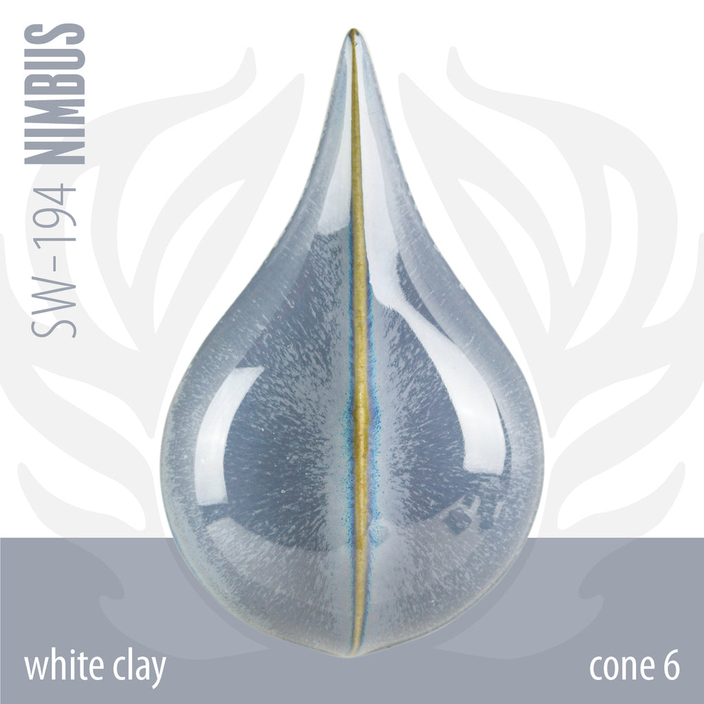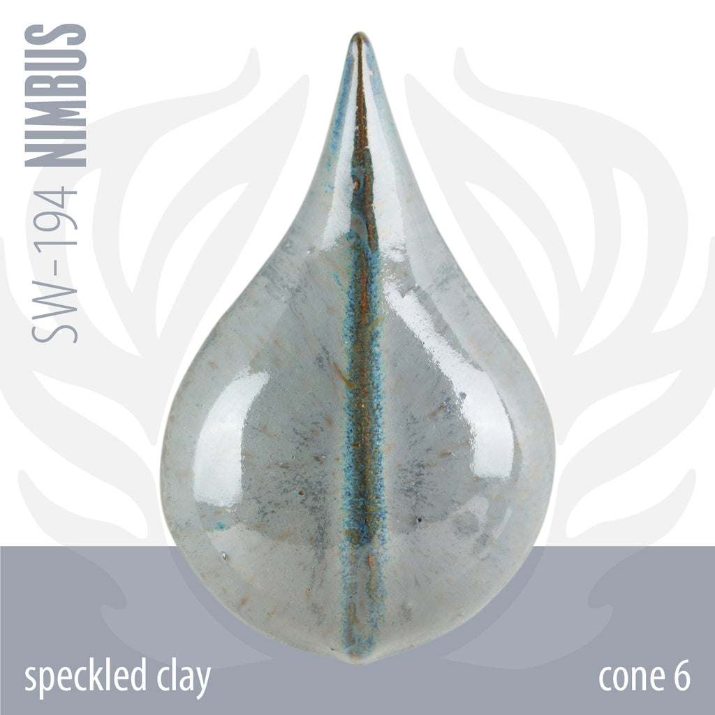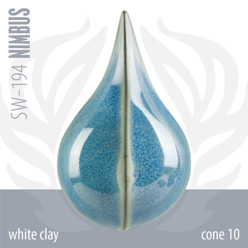 Cone 6 oxidation: Nimbus is a glossy, opaque, variegated blue glaze that breaks over texture and has an iridescent sheen. Blue micro-crystalization may develop.