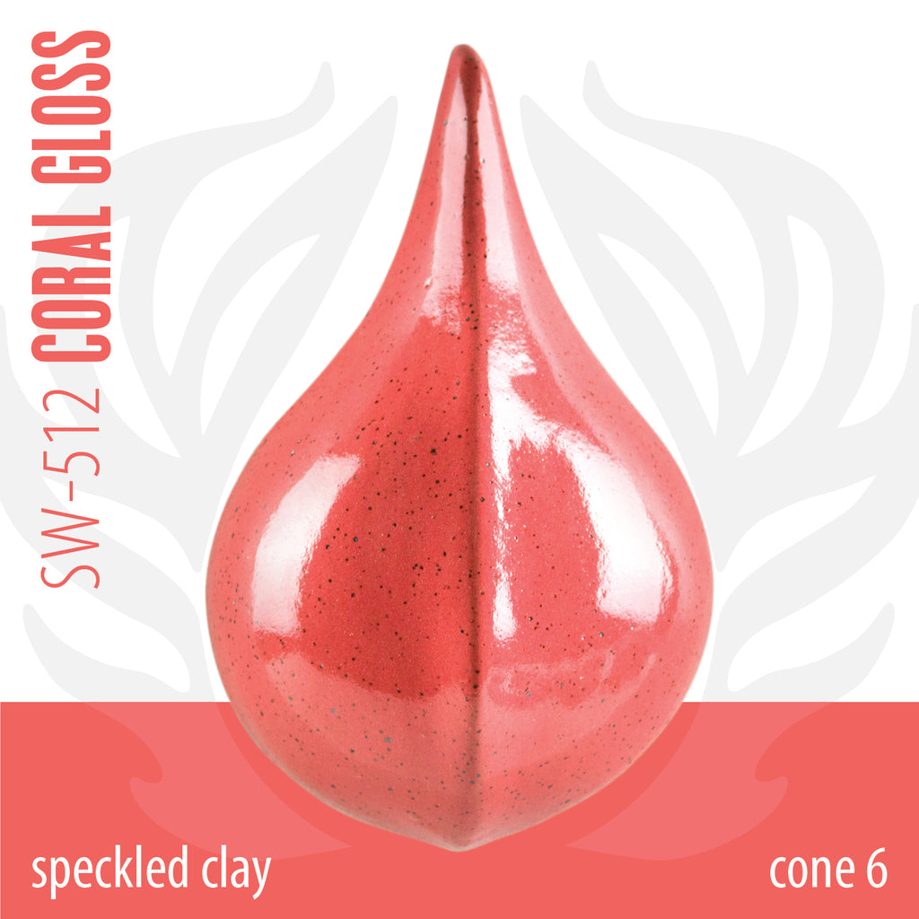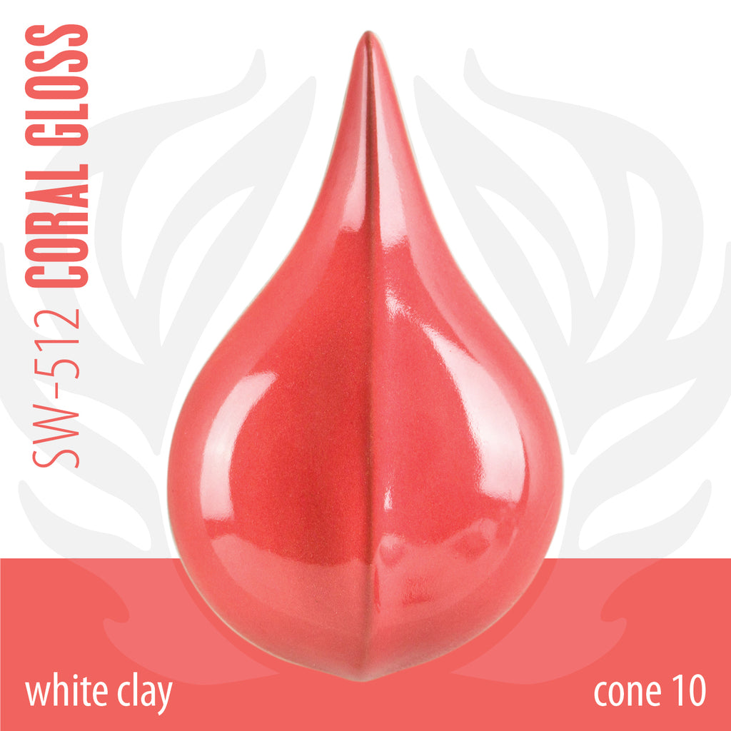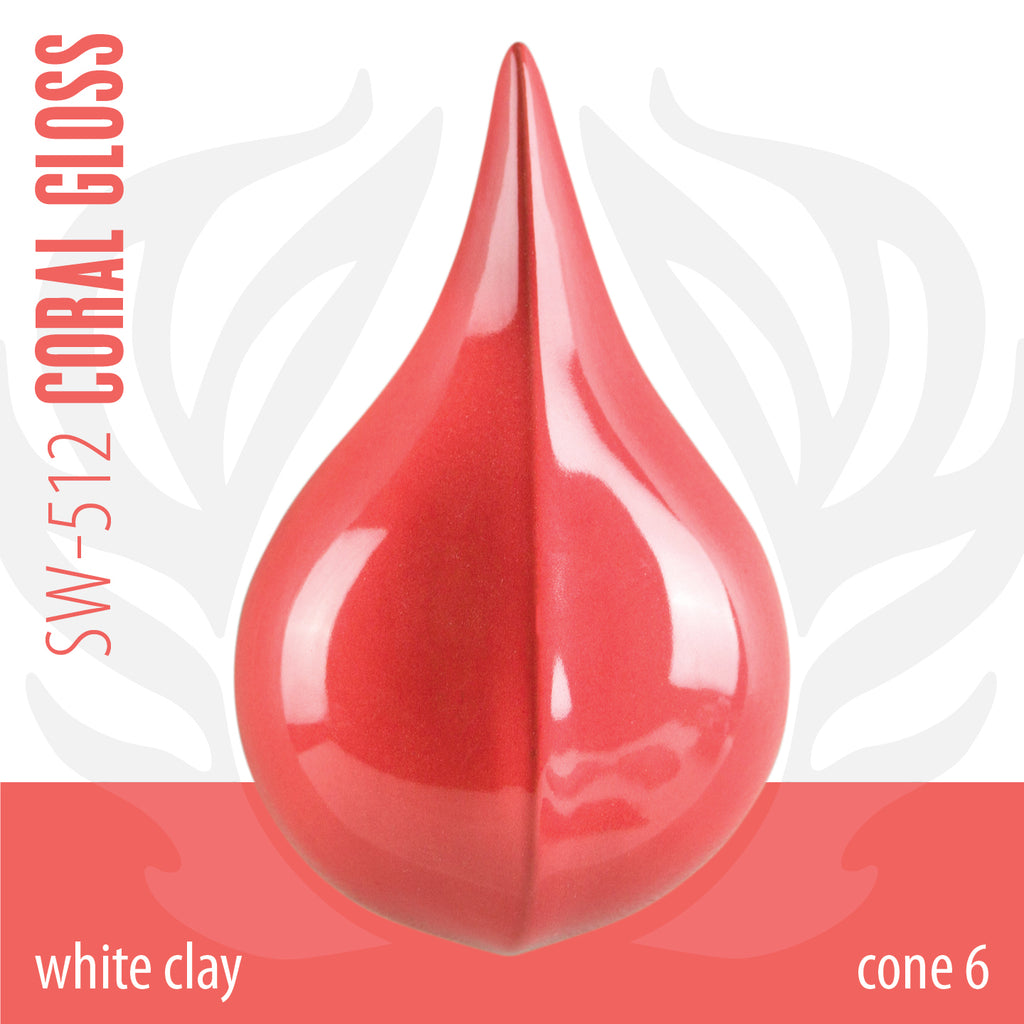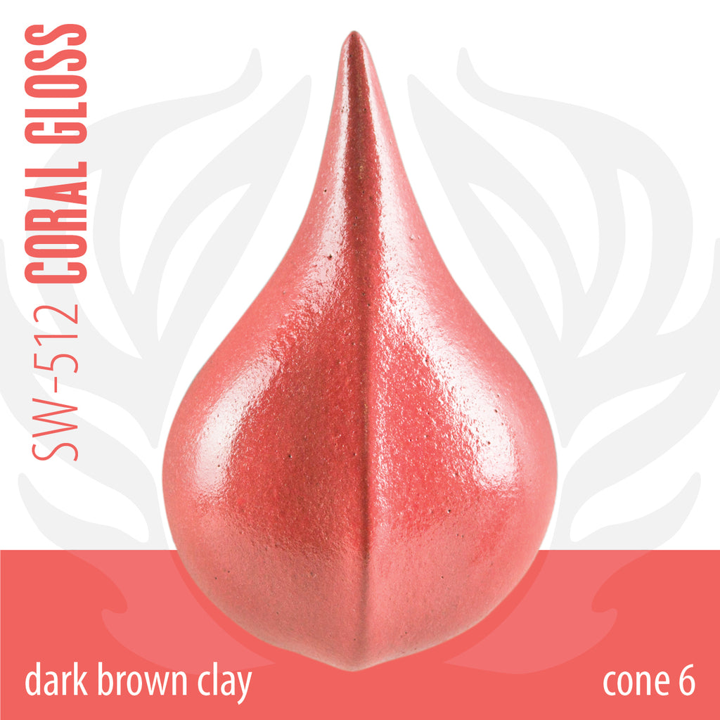 Cone 6 oxidation (First photo): Coral Gloss is a glossy, opaque, vibrant coral glaze that is highly pigmented and formulated for stable design work at midrange temperatures and above.