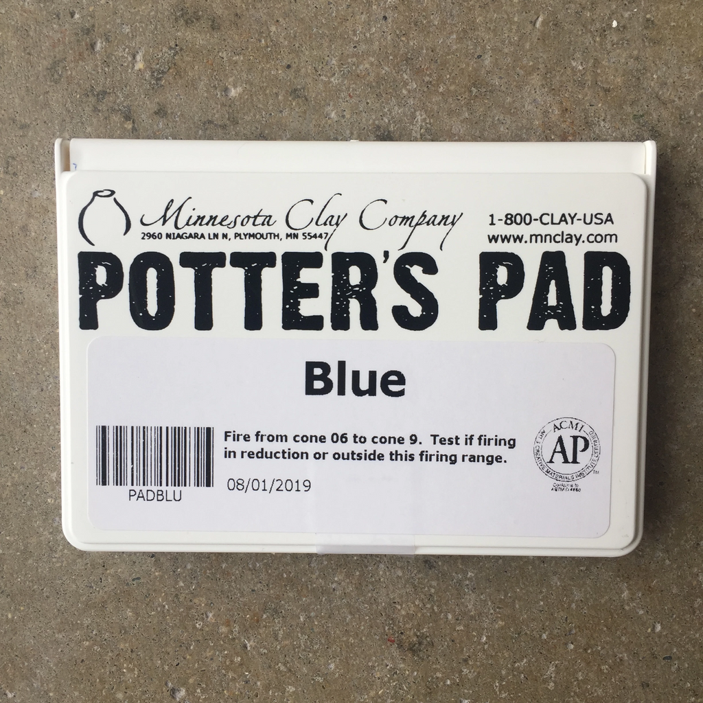 Finally! An easy way to use traditional rubber stamps with underglazes!! These great underglaze stamp pads by Minnesota Clay function just like ink pads, but are made from underglazes rather than ink. Simply use your favorite rubber or wooden stamp and gently press the stamp into the potter's pad. Then transfer the inked stamp image onto your green or bisqued pot and voila! Glaze over the image with a clear or other transparent glaze and fire to glaze requirements.