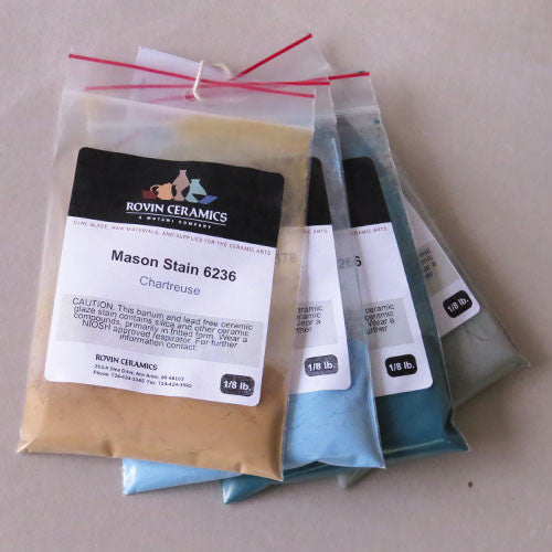 Mason Stains ® (by Mason Color Works) are colorants in frit form, which renders them insoluble, removes volatiles, and allows for better control of final product. When used as a glaze stain, we generally recommend adding the stain at 5-8% dry weight to a dry base glaze. The base glaze should contain 12-15% calcium carbonate (whiting) and be free of zinc to achieve the color desired. Mason Stains can also be painted on bisque as an underglaze. Experimentation is necessary to achieve the desired results, but the advantage of Mason Stains is their consistent results in glaze firing.