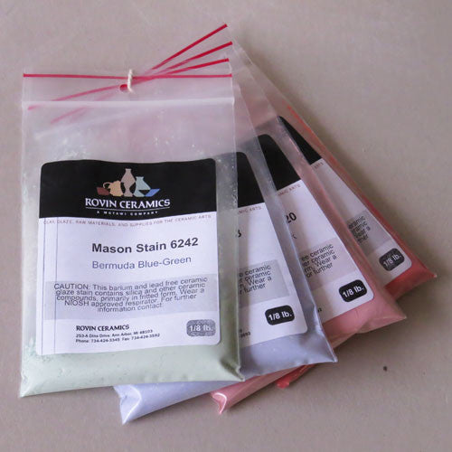 Mason Stains ® (by Mason Color Works) are colorants in frit form, which renders them insoluble, removes volatiles, and allows for better control of final product. When used as a glaze stain, we generally recommend adding the stain at 5-8% dry weight to a dry base glaze. The base glaze should contain 12-15% calcium carbonate (whiting) and be free of zinc to achieve the color desired. Mason Stains can also be painted on bisque as an underglaze. Experimentation is necessary to achieve the desired results, but the advantage of Mason Stains is their consistent results in glaze firing.