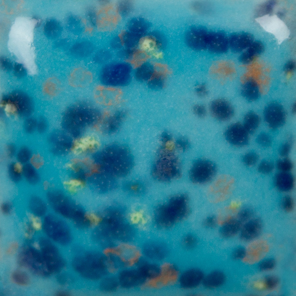 Speckled Jaded is a heavily pigmented, viscous Stroke & Coat® glaze with yellow, orange and blue specks that can be used for brush strokes or opaque coverage. One coat will create a translucent finish with subsequent coats adding opacity. We suggest two to three coats for full opacity and all over coverage. Will fire to a gloss finish without clear glaze.