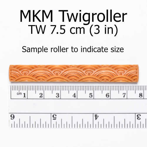 TW Twig Hand Rollers are 7.5 cm (3 inches) long and 1 cm (0.4 inch) in diameter. You simply roll the TW roller with your hand across the clay or up the wall of a pot to create a beautiful pattern in any clay.