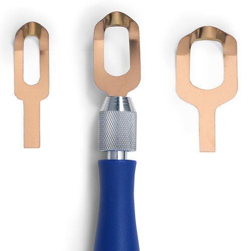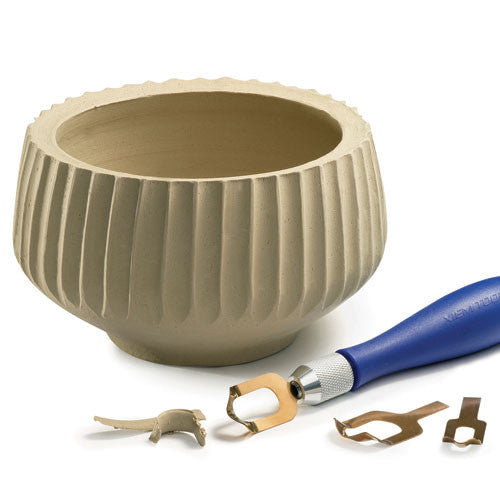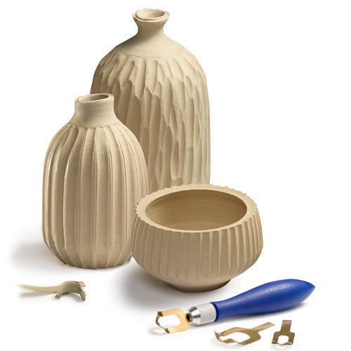 Xiem Fluting Tool Set is a quick and easy way to make the concave surface textures for both functional and non-functional ceramics. It has three interchangeable blade sizes (S, M, L) to give artists the flexibility and freedom to create their work without size limitations. The titanium bonded blades offer a superior cutting edge retention and rust resistant while the angled blade design provides a consistent depth and evenly smooth in every cut. They are three times harder than steel which makes them the ideal cutting edge for carving on a leather-hard clay. The ergonomic handle is comfortable to hold and will not roll off the table.