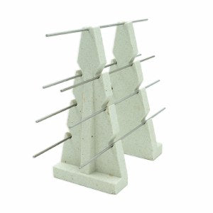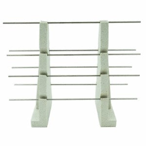 This rack measures 8" tall and is made from two durable stoneware supports. It includes seven pieces of 10" long nichrome wires. The wires rest on grooves in the rack, so they can be easily rearranged to accommodate different size pieces.