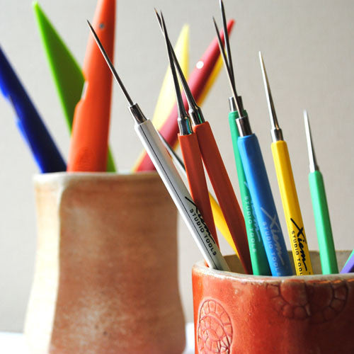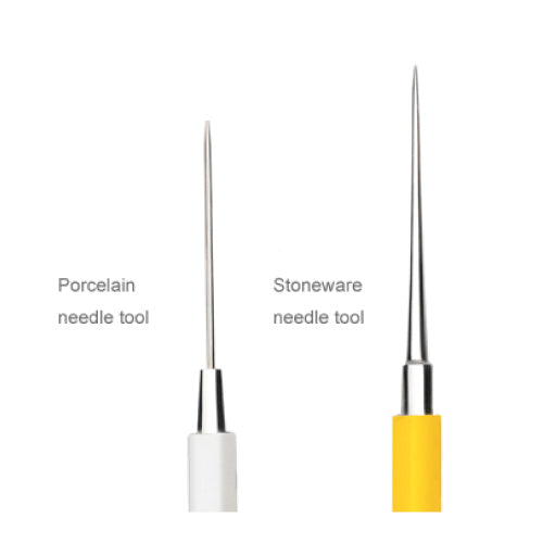 This robust needle tool is designed for potters who need to remove a thick uneven rim of a coarse clay body on the pottery wheel. Each tool is made from a solid piece of surgical stainless steel to ensure sharpness and quality for life .The sharp point needle allows cutting through thick clay quickly and smoothly. The broader base of the needle helps to separate and split clay away with ease, avoiding bending and breaking. The facetted handle with inset rubber for comfort and secure gripping won’t roll off the table. Available in six colors.